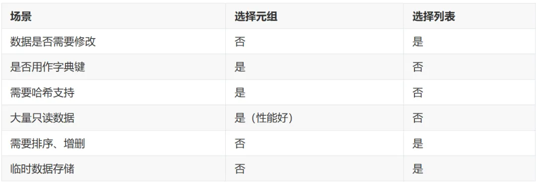 •如果数据创建后不需要修改 → 选择元组•如果数据需要动态变化 → 选择列表•如果需要哈希支持 → 必须用元组