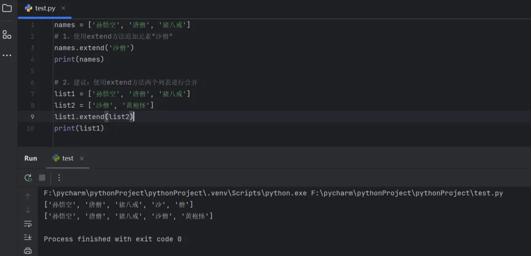 names = ['孙悟空', '唐僧', '猪八戒']# 1、使用extend方法追加元素"沙僧"names.extend('沙僧')print(names)# 2、建议:使用extend方法两个列表进行合并list1 = ['孙悟空', '唐僧', '猪八戒']list2 = ['沙僧', '黄袍怪']list1.extend(list2)print(list1)