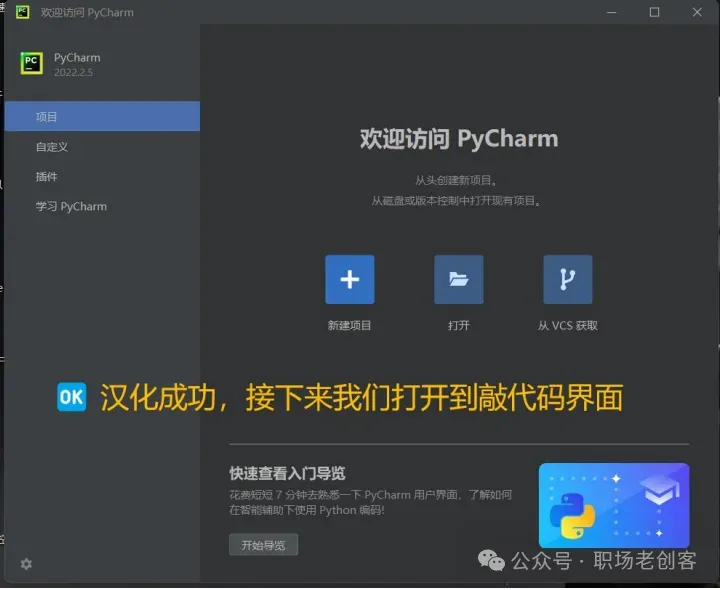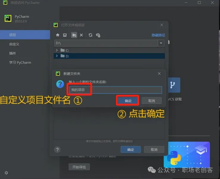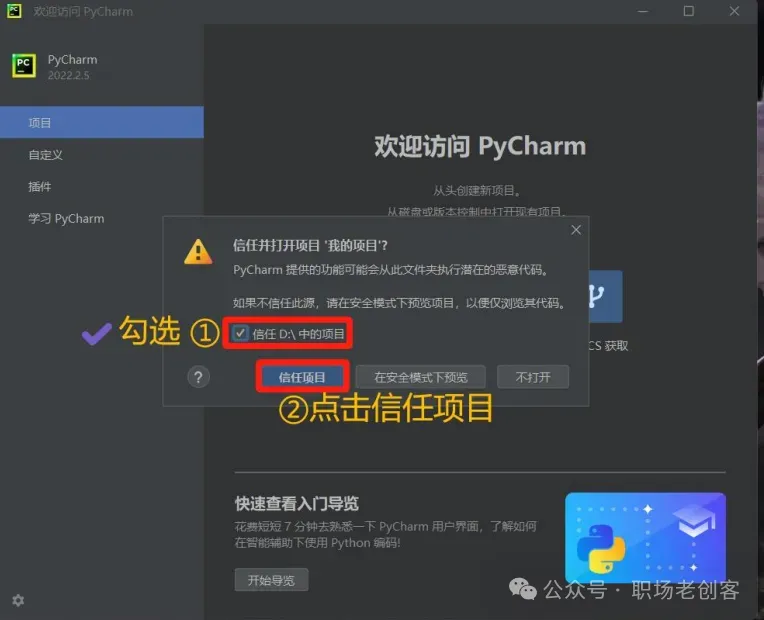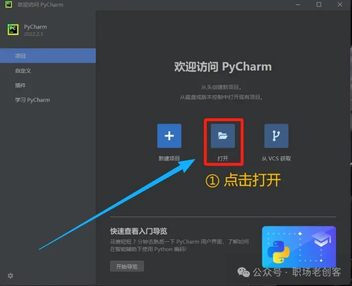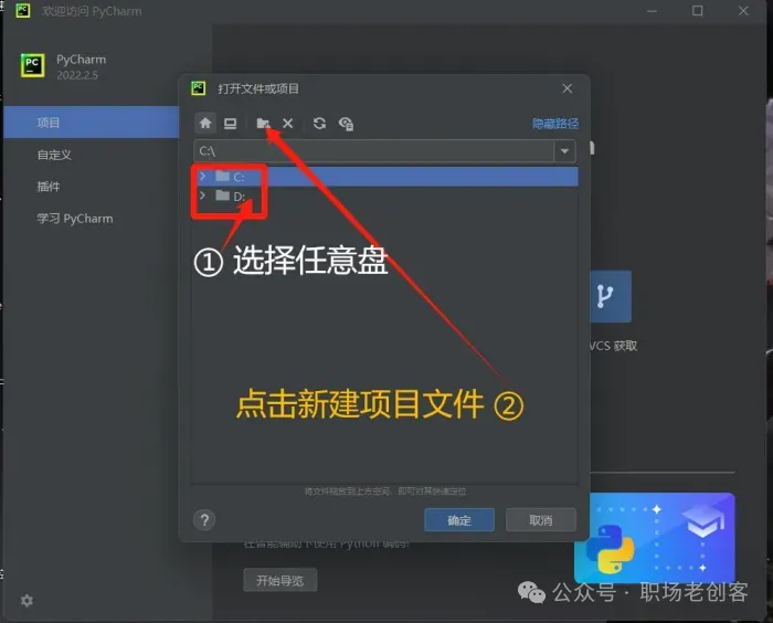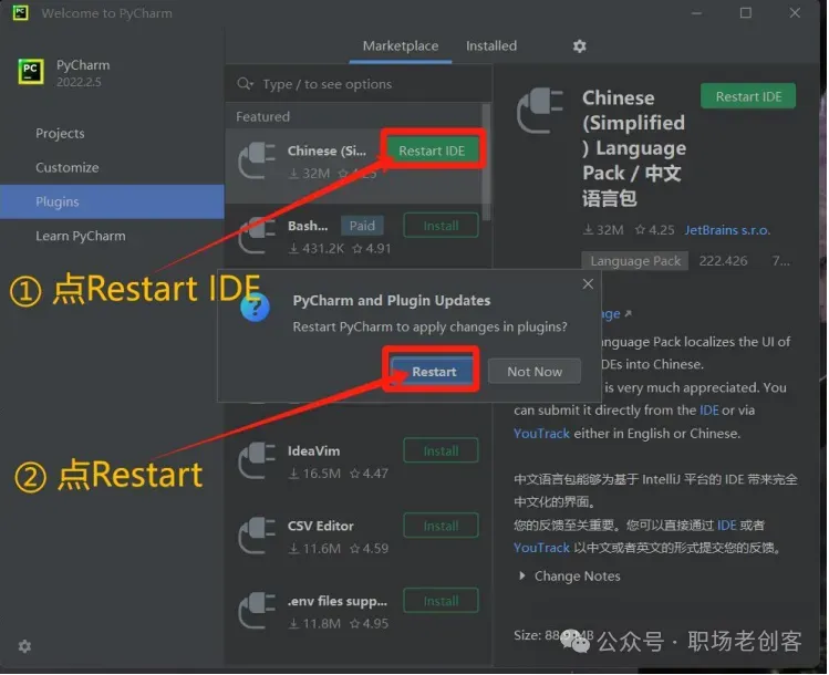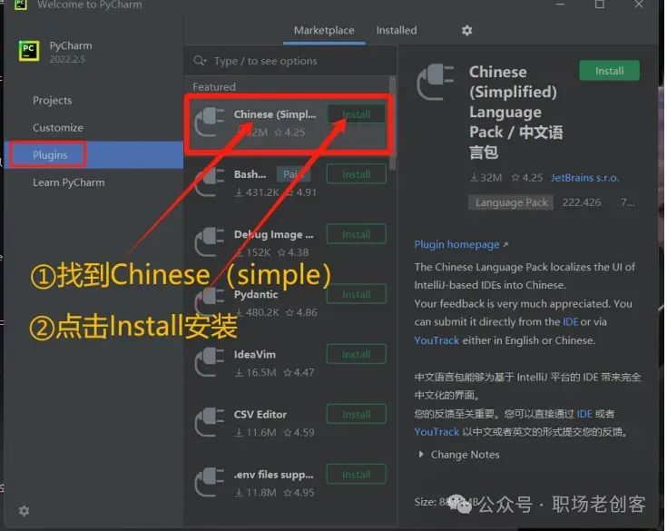 1.1 找到下载的Python安装文件,双击进行安装。(Python下载的方法咱们已经在课程里详细介绍了)1.2 现勾选添加路径,再点击 install now 安装。。。。!!!Python安装成功后,不要打开,直接去安装PyCharm!!!2.2 Pycharm 可以自行更改安装路径,更改完成点击下一步2.7 第一次打开PyCharm需要选择一下(以后再次打开就不用了),勾选之后,直接点继续2.9 进入界面之后,先汉化,找到 plugins 插2.10 搜索Chinese,然后点击install安装2.11 点击 restart IDE 再点 restart 重新一下2.14 选择任意一个盘,最好是D、E、F。。中的一个盘,然后新建一个项目文件。