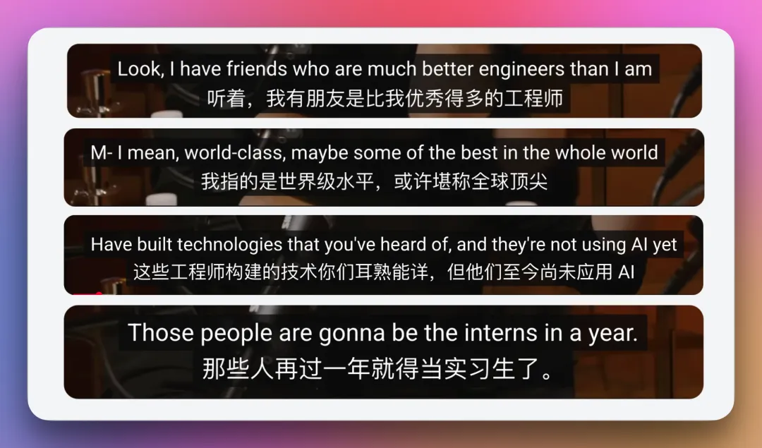 “我的一些朋友在工程方面的能力远超于我,我是说,世界一流的,也许是全球顶尖的水平,这些人曾开发出你耳熟能详的技术,但他们至今仍未使用AI,除了偶尔会用 Cursor 询问一个聊天问题,那些人再过一年就会变成实习生。”