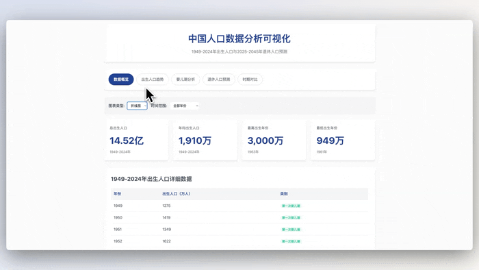 请帮我调研1949年-2024年,新生人口出生总数,使用权威数据,交叉验证,标记婴儿潮年份。并调研2025年-2045年退休人口数量。第二步:数据分析