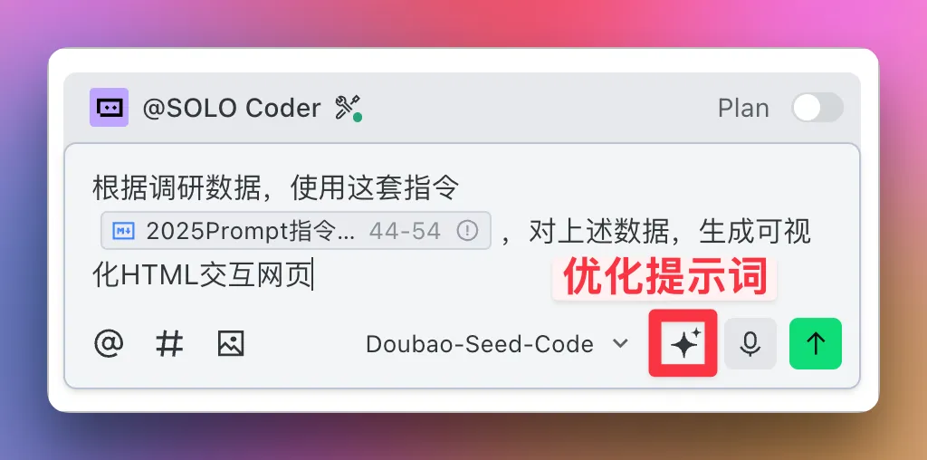 直接把你的设计需求甩给 Trae。这是我输入的指令,这里有一个小技巧,是就是TRAE更懂编程,我们输入基本要求后,使用优化提示词,一般可以得到一个更为丰富具体的提示词。