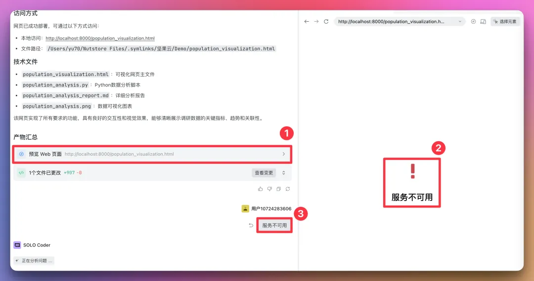 如果遇到一些特殊情况,报错了,试着把遇到的问题描述给AI,这种服务不可用的问题一次就能解决。
