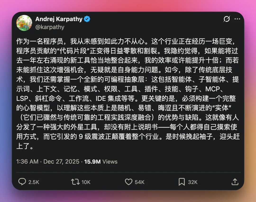 前几天,AI大神 Andrej Karpathy(前特斯拉AI总监)的一段感慨也刷爆朋友圈了:
