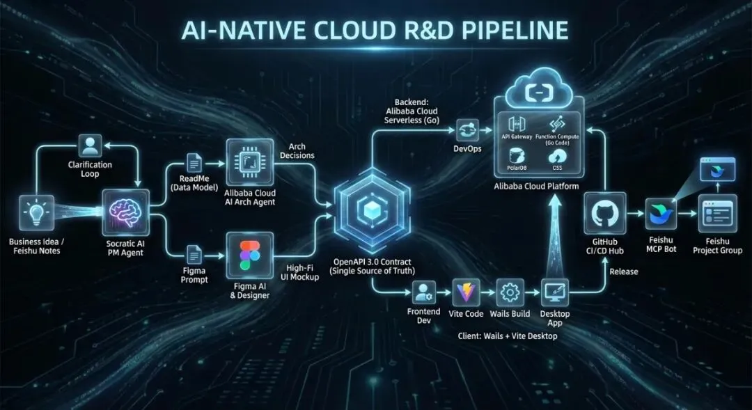 我们提议构建一套全新的流水线,其核心理念是:AI 负责定义与设计,人类负责审核与实现,机器负责自动化流转。双 Agent 核心: 引入专职的 AI Agent 分别处理需求结构化和架构自动化。阿里云原生底座: 全面采用 Serverless 和托管服务,确保弹性与低运维成本。规范驱动开发 (SDD): 强制使用 OpenAPI 作为唯一真理来源,解耦前后端。现代跨平台交付: 利用 Wails 和 Web 技术栈提供卓越的桌面端体验。飞书全链路集成: 将研发流程无缝嵌入企业的沟通协作平台。