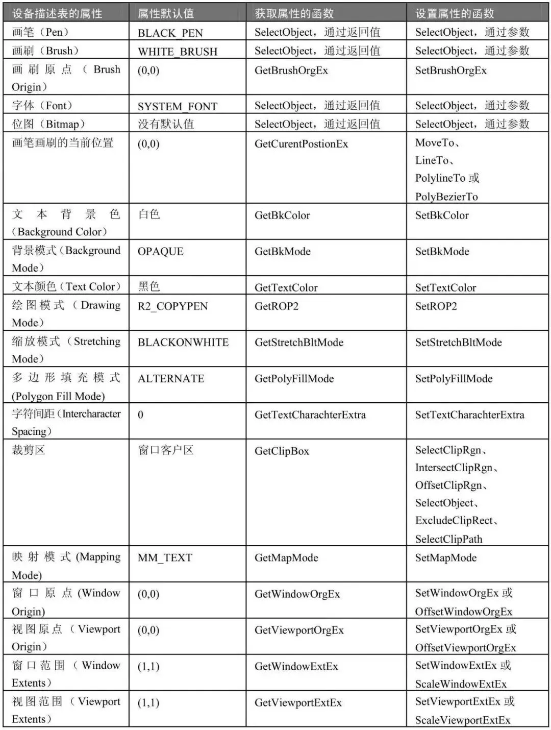 设备描述表包含在窗口上进行绘图操作所需的环境信息,这些环境信息就是设备描述表的属性,比如当前环境的颜色、坐标、映射模式、绘制文本所用的字体等。