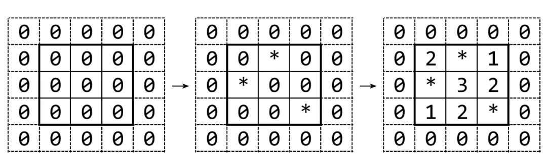 上面这个方法是辅助行列处理边界问题,建立二维数组多建了两行两列,辅助行和辅助列默认是0,自然没有星号,如图所示,3×3的扫雷图,外面多的一圈就是辅助行列。