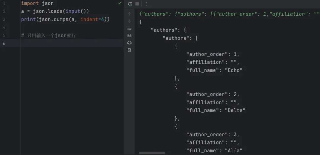 import jsonjsonData = '{"a":1,"b":2,"c":3,"d":4,"e":5}';text = json.loads(jsonData)print(text)# 运行结果:{'a': 1, 'b': 2, 'c': 3, 'd': 4, 'e': 5}