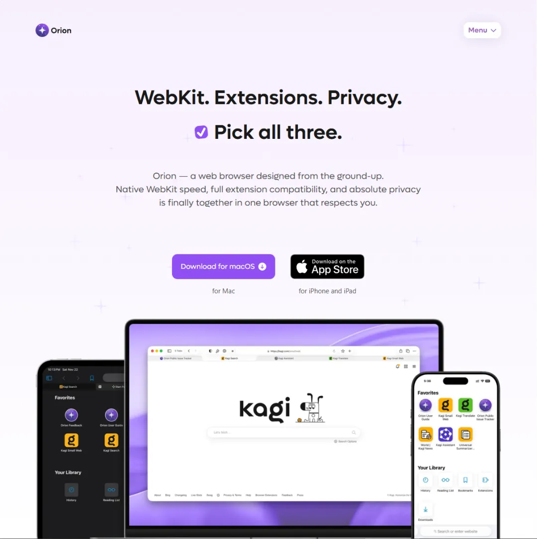 对于身处苹果生态的用户来说,Orion 是目前唯一能完美平衡“原生手感”与“强力插件”的选择。它专门为 macOS 和 iOS 打造,在保持了像 Safari 一样极速和省电体验的同时,还能兼容 Chrome 和 Firefox 的所有插件。