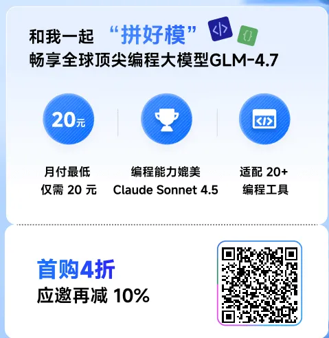 🚀 速来拼好模,智谱 GLM Coding 超值订阅,邀你一起薅羊毛!Claude Code、Cline 等 20+ 大编程工具无缝支持,“码力”全开,越拼越爽!立即开拼,享限时惊喜价! 链接:https://www.bigmodel.cn/glm-coding?ic=RTWWS8HOD6⏰ 活动截止:2026 年 1 月 15 日