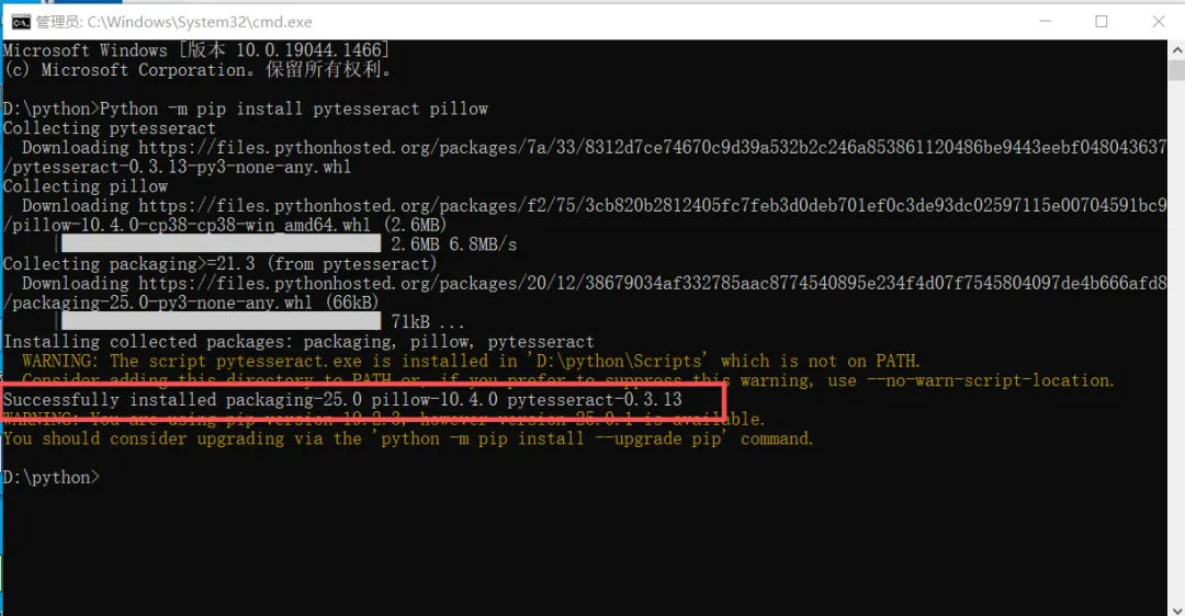 在python的安装文件夹中输入“cmd”,输入Python -m pip install pytesseract pillow进行pytesseract的安装,安装完成如图7所示。