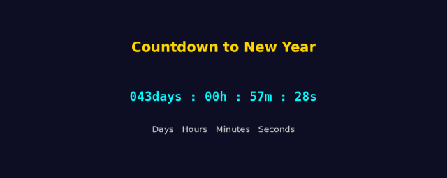import matplotlib.pyplot as pltimport matplotlib.animation as animationimport datetime# 目标时间target = datetime.datetime(2026, 2, 17, 0, 0, 0)# 创建图形fig, ax = plt.subplots(figsize=(10, 4))ax.axis('off')fig.patch.set_facecolor('#0d0d23')ax.set_facecolor('#0d0d23')# 标题title = ax.text(0.5, 0.75, f"Countdown to New Year",ha='center', va='center', fontsize=22, color='gold', fontweight='bold')# 倒计时数字(大字)text = ax.text(0.5, 0.45, '', ha='center', va='center', fontsize=20,color='white', fontfamily='monospace', fontweight='bold')# 单位提示(小字)units = ax.text(0.5, 0.25,'Days Hours Minutes Seconds',ha='center', va='center', fontsize=14, color='lightgray')def update(frame):# 每次更新都重新计算剩余时间now = datetime.datetime.now()delta = target - nowif delta.total_seconds() > 0:total_sec = int(delta.total_seconds())days = total_sec // (24*3600)hours = (total_sec % (24*3600)) // 3600minutes = (total_sec % 3600) // 60seconds = total_sec % 60# 格式化为 DD : HH : MM : SScountdown_str = f"{days:03d}days : {hours:02d}h : {minutes:02d}m : {seconds:02d}s"text.set_text(countdown_str)text.set_color('cyan' if seconds % 2 == 0 else 'lightgreen') # 轻微闪烁效果else:text.set_text("HAPPY NEW YEAR!")text.set_color('gold')units.set_text("")return text, units# 每1000ms(1秒)刷新一次;repeat=False 表示播完不循环anim = animation.FuncAnimation(fig, update, interval=1000, blit=True, repeat=False)plt.tight_layout()plt.show()