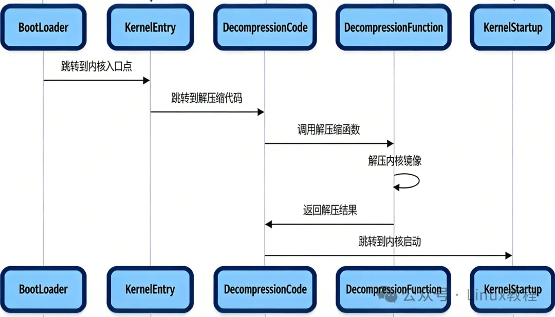 内核从加载到完成解压的核心流程可概括为:引导加载程序(Bootloader)→ 跳转到内核入口点 → 执行解压缩代码 → 调用解压函数 → 解压内核映像 → 返回解压结果 → 跳转到内核启动流程(Kernel Startup)