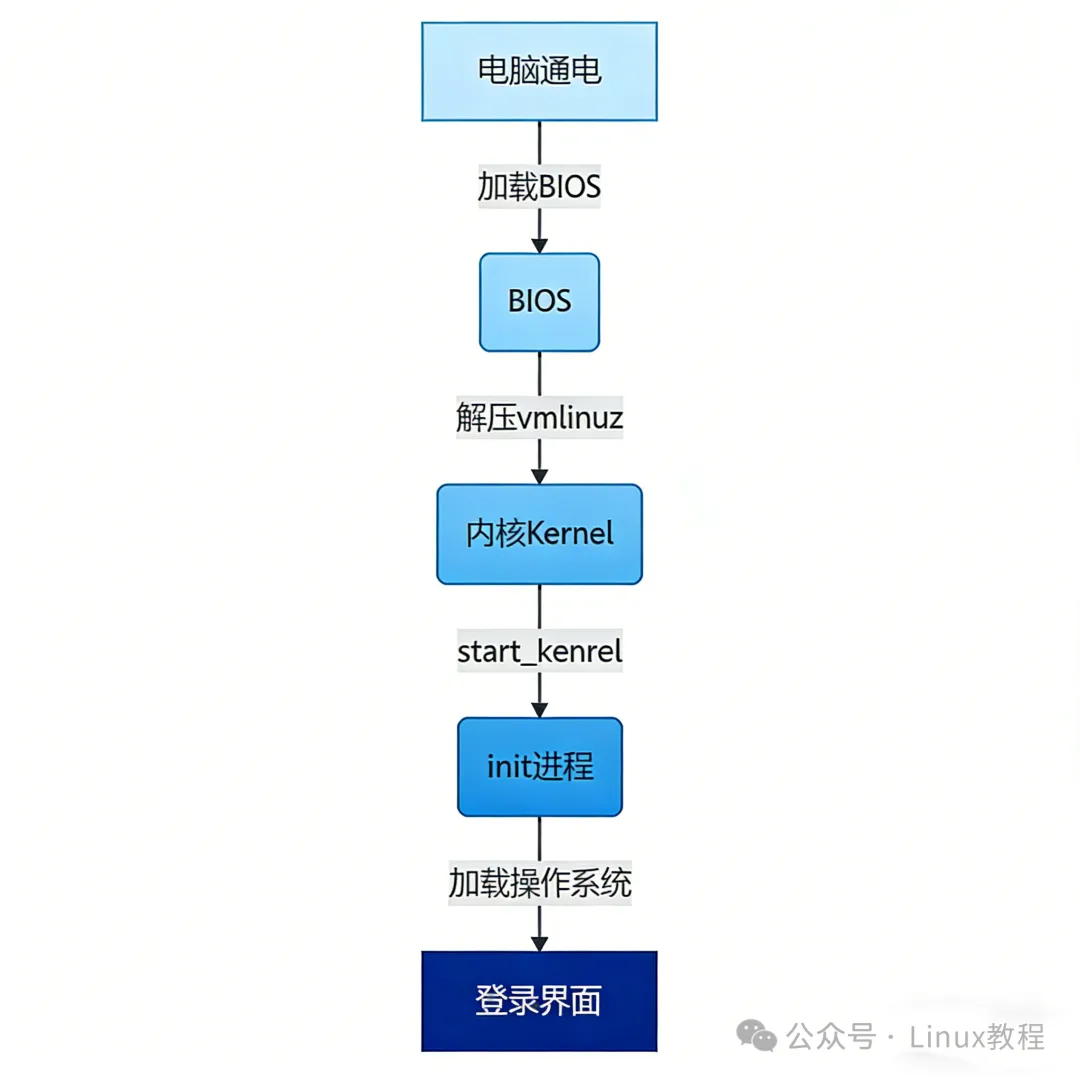 电脑通电 → 加载BIOS(硬件自检与初始化) → 引导加载程序(Bootloader)启动 → 加载压缩内核映像(vmlinuz)与initrd/initramfs → 解压vmlinuz → 执行start_kernel函数(内核初始化) → 启动init进程(1号进程) → 执行系统初始化脚本 → 启动用户服务与图形界面 → 进入登录界面 → 系统启动完成