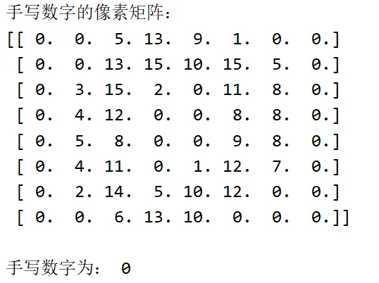 运行后,你会看到控制台输出一个 8x8 的像素矩阵(因为该数据集的每个手写数字图像都是 8x8 像素),然后显示对应的数字标签,最后弹出一个窗口显示该手写数字的图像。