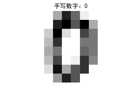 import matplotlib.pyplot as pltfrom sklearn import datasets# 解决中文显示问题plt.rcParams['font.sans-serif'] = ['SimHei'] # 解决中文显示问题plt.rcParams['axes.unicode_minus'] = False # 解决负号显示问题# 加载手写数字数据集(Sklearn内置)#digits 里包含所有图片(images)和对应的数字标签(target)digits = datasets.load_digits()# 获取数据集中的第一个图像(第1个样本)及其标签digital = digits.images[0] # 第一个图像的像素矩阵label = digits.target[0] # 第一个图像对应的数字标签# 打印图像的像素矩阵print("手写数字的像素矩阵:")print(digital)# 打印对应的标签(实际数字)print("\n手写数字为:", label)# 绘制图像时,增加标题显示数字标签plt.title(f"手写数字:{label}") # 新增这一行plt.axis('off') # 关闭坐标轴显示# 以灰度反转模式显示图像#imshow:把像素矩阵转换成图像显示;#cmap='gray_r':用“灰度反转”模式显示(数字的笔画是黑色、背景是白色,更符合手写数字的视觉习惯)。plt.imshow(digital, cmap=plt.get_cmap('gray_r'))plt.show() # 显示图像