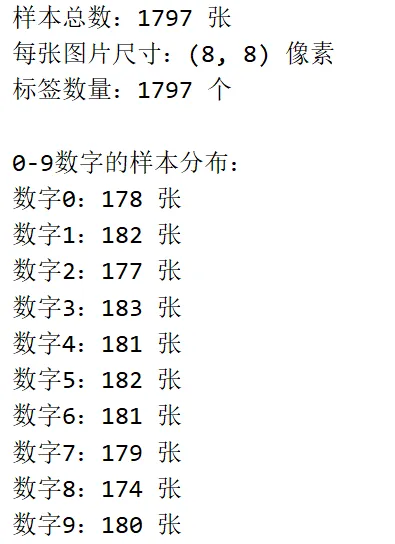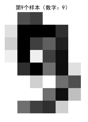 import matplotlib.pyplot as pltfrom sklearn import datasetsimport numpy as np# 解决中文显示问题plt.rcParams['font.sans-serif'] = ['SimHei']plt.rcParams['axes.unicode_minus'] = False# 加载数据集digits = datasets.load_digits()# 1. 查看数据集基本信息print(f"样本总数:{digits.images.shape[0]} 张") # 1797张手写数字print(f"每张图片尺寸:{digits.images.shape[1:]} 像素") # 8×8像素print(f"标签数量:{digits.target.shape[0]} 个") # 每个样本对应一个标签# 2. 统计0-9每个数字的样本数print("\n0-9数字的样本分布:")for i in range(10):count = np.sum(digits.target == i)print(f"数字{i}:{count} 张")#前 20 个索引对应的数字:print("前20个索引对应的数字:")for i in range(20):print(f"索引{i} → 数字{digits.target[i]}")# 3. 显示任意一个样本(修改index可查看不同样本)index = 9 # 可改为0-1796之间的任意整数digital = digits.images[index]label = digits.target[index]print(f"\n第{index}个样本的像素矩阵:")print(digital)print(f"对应的数字:{label}")# 可视化该样本plt.figure(figsize=(4, 4))plt.axis('off')plt.imshow(digital, cmap='gray_r')plt.title(f"第{index}个样本(数字:{label})")plt.show()