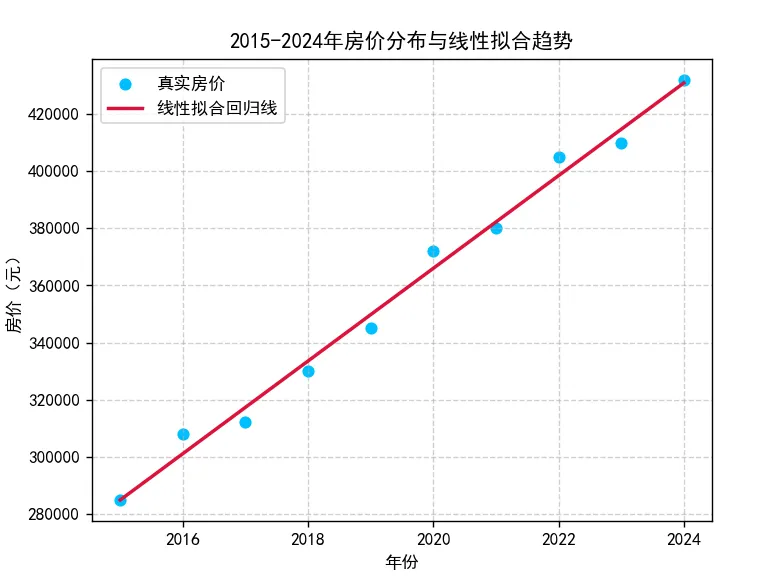 # 导入所需库import numpy as npimport matplotlib.pyplot as pltfrom sklearn.linear_model import LinearRegression# 2015-2024年年份+带波动房价x = np.array([2015, 2016, 2017, 2018, 2019, 2020, 2021, 2022, 2023, 2024])y = np.array([285000, 308000, 312000, 330000, 345000, 372000, 380000, 405000, 410000, 432000])# 创建线性回归模型实例model = LinearRegression()# 训练模型(内嵌reshape,省略中间变量,代码更简洁)model.fit(x.reshape(-1, 1), y)# 对训练数据进行拟合预测(用于绘制回归线)y_predict = model.predict(x.reshape(-1, 1))# 绘制可视化图表plt.rcParams['font.sans-serif'] = ['SimHei'] # 解决中文显示乱码plt.rcParams['axes.unicode_minus'] = False # 解决负号显示异常plt.scatter(x, y, color='deepskyblue', label='真实房价') # 绘制真实房价散点图plt.plot(x, y_predict, color='crimson', linewidth=2, label='线性拟合回归线') # 绘制拟合回归线# 设置图表标签和标题plt.xlabel('年份')plt.ylabel('房价(元)')plt.title('2015-2024年房价分布与线性拟合趋势')plt.legend() # 显示图例plt.grid(linestyle='--', alpha=0.6) # 添加网格线,便于读数plt.show() # 显示图表