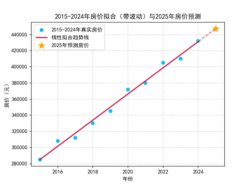 运行结果:2025 年房价预测值为:447200.00 元,同时弹出包含真实房价、拟合线和 2025 年预测值的可视化图表。
