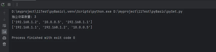 # 用户访问日志中的IP地址去重ip_logs = [ '192.168.1.1', '192.168.1.2', '192.168.1.1', '10.0.0.5', '192.168.1.2', '10.0.0.5'] # 方法1:转换为集合去重 unique_ips = list(set(ip_logs)) print(f"独立访客数量: {len(unique_ips)}") # 3 print(unique_ips) # 方法2:保留原始顺序的去重 unique_ips_ordered = list(dict.fromkeys(ip_logs)) print(unique_ips_ordered)