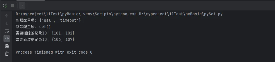 # 场景:找出需要新增的配置项old_config = {'host', 'port', 'user', 'password'}new_config = {'host', 'port', 'user', 'password', 'timeout', 'ssl'}# 方法1:使用 - 运算符added_items = new_config - old_configremoved_items = old_config - new_configprint(f"新增配置项: {added_items}")print(f"移除配置项: {removed_items}")# 方法2:使用 difference() 方法added_items = new_config.difference(old_config)# 实战:数据库同步场景db_records = {101, 102, 103, 104, 105}excel_records = {103, 104, 105, 106, 107}# 找出需要删除的记录(数据库有但Excel没有)to_delete = db_records - excel_recordsprint(f"需要删除的记录ID: {to_delete}") # {101, 102}# 找出需要新增的记录(Excel有但数据库没有)to_insert = excel_records - db_recordsprint(f"需要新增的记录ID: {to_insert}") # {106, 107}