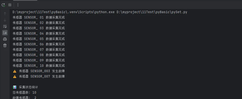 classDataCollector:"""模拟上位机数据采集器"""def__init__(self):self.collected_sensors = set() # 已采集的传感器IDself.error_sensors = set() # 故障传感器IDdefcollect_data(self, sensor_id):"""采集单个传感器数据"""self.collected_sensors.add(sensor_id)print(f"传感器 {sensor_id} 数据采集完成")defreport_error(self, sensor_id):"""报告传感器故障"""self.error_sensors.add(sensor_id)print(f"⚠️ 传感器 {sensor_id} 发生故障")defget_healthy_sensors(self):"""获取正常工作的传感器"""returnself.collected_sensors - self.error_sensorsdefget_status(self):"""获取采集状态""" total = len(self.collected_sensors) errors = len(self.error_sensors) healthy = len(self.get_healthy_sensors())print(f"\n📊 采集状态统计")print(f"总传感器数: {total}")print(f"故障传感器: {errors}")print(f"正常传感器: {healthy}")print(f"正常率: {healthy/total*100:.1f}%")# 使用示例collector = DataCollector()# 模拟数据采集for sensor_id inrange(1, 11): collector.collect_data(f"SENSOR_{sensor_id: 03d}")# 模拟故障上报collector.report_error("SENSOR_003")collector.report_error("SENSOR_007")# 查看状态collector.get_status()