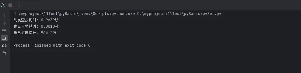 import time # 准备测试数据 large_list = list(range(10000)) large_set = set(range(10000)) search_targets = [999, 5000, 9999] # 列表查找性能测试 start = time.time() for target in search_targets * 10000: if target in large_list: passlist_time = time.time() - start # 集合查找性能测试 start = time.time() for target in search_targets * 10000: if target in large_set: passset_time = time.time() - start print(f"列表查找耗时: {list_time:.4f}秒") print(f"集合查找耗时: {set_time:.4f}秒") print(f"集合速度提升: {list_time/set_time:.1f}倍")