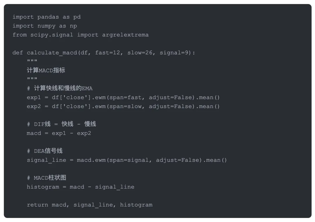 光有识别函数还不够,我们需要一个完整的交易系统。这个系统要能够读取历史数据、计算MACD、识别形态、生成交易信号。下面是我常用的一个框架: