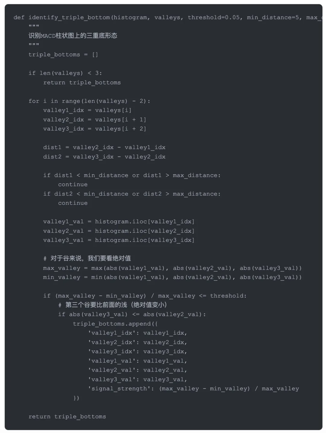 你看这个函数里,我加了一个signal_strength的计算。这个是用来评估信号质量的,数值越小说明三个峰越接近,形态越标准,信号就越可靠。实际交易中我一般只用signal_strength小于0.03的信号。