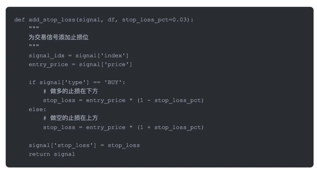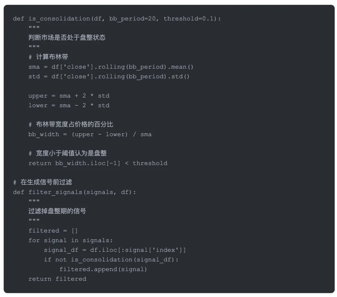 这个类的设计思路是把分析和信号生成分开。analyze方法负责识别形态,generate_signals方法负责把形态转化成可执行的交易信号。这样做的好处是灵活,你可以在信号生成环节加入各种过滤条件。