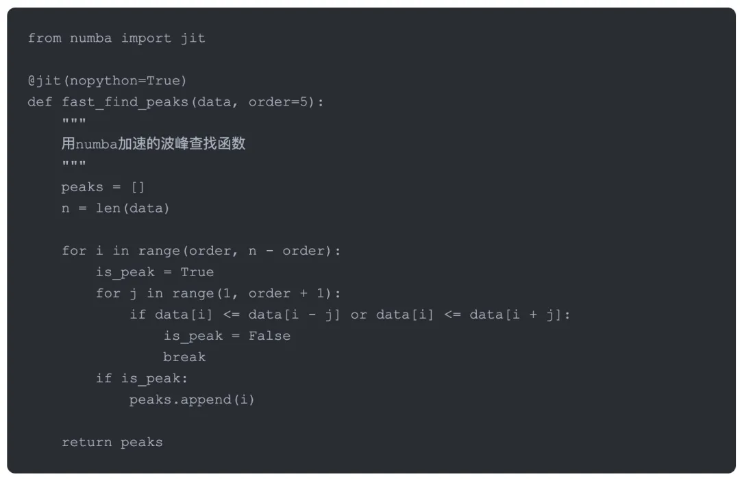 后来我做了两个优化。一个是用numpy向量化计算替代循环,速度提升了10倍。第二个是用numba的JIT编译,把关键函数编译成机器码,又快了5倍。现在分析一个品种只要0.1秒左右,可以同时监控上百个品种了。