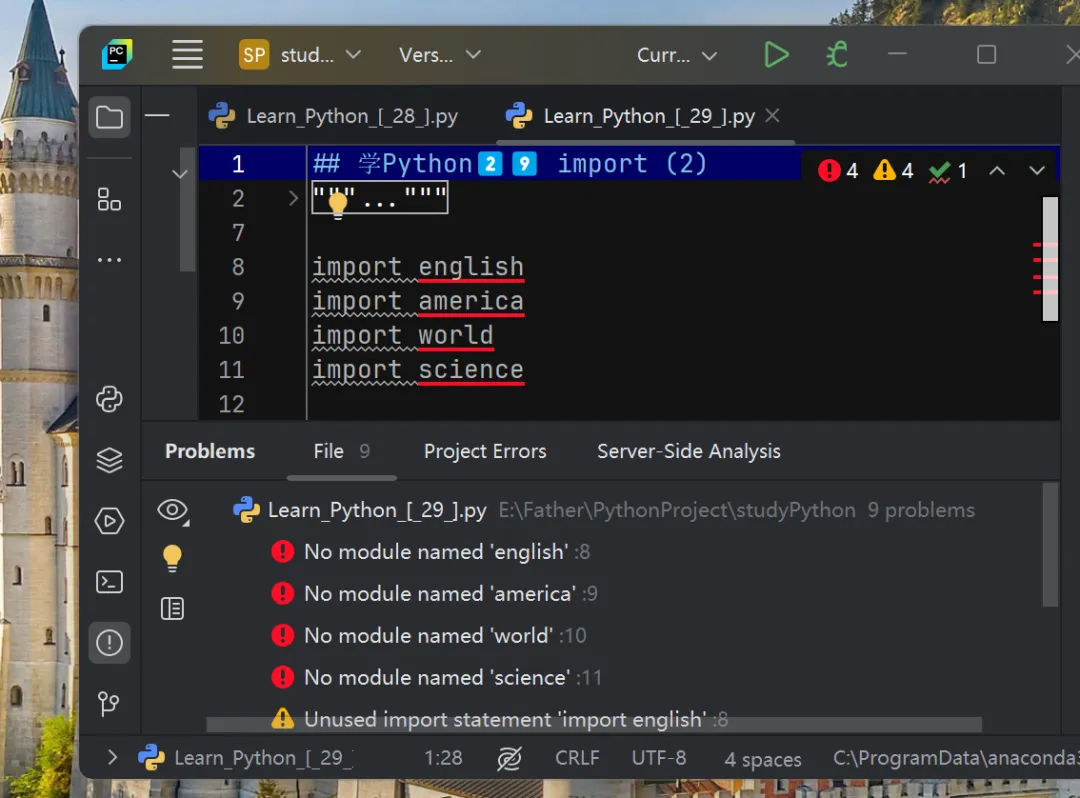 假如在事先没有安装的情况下,就在代码中 import,Python静态语法检查时,就会有一个报错。如: