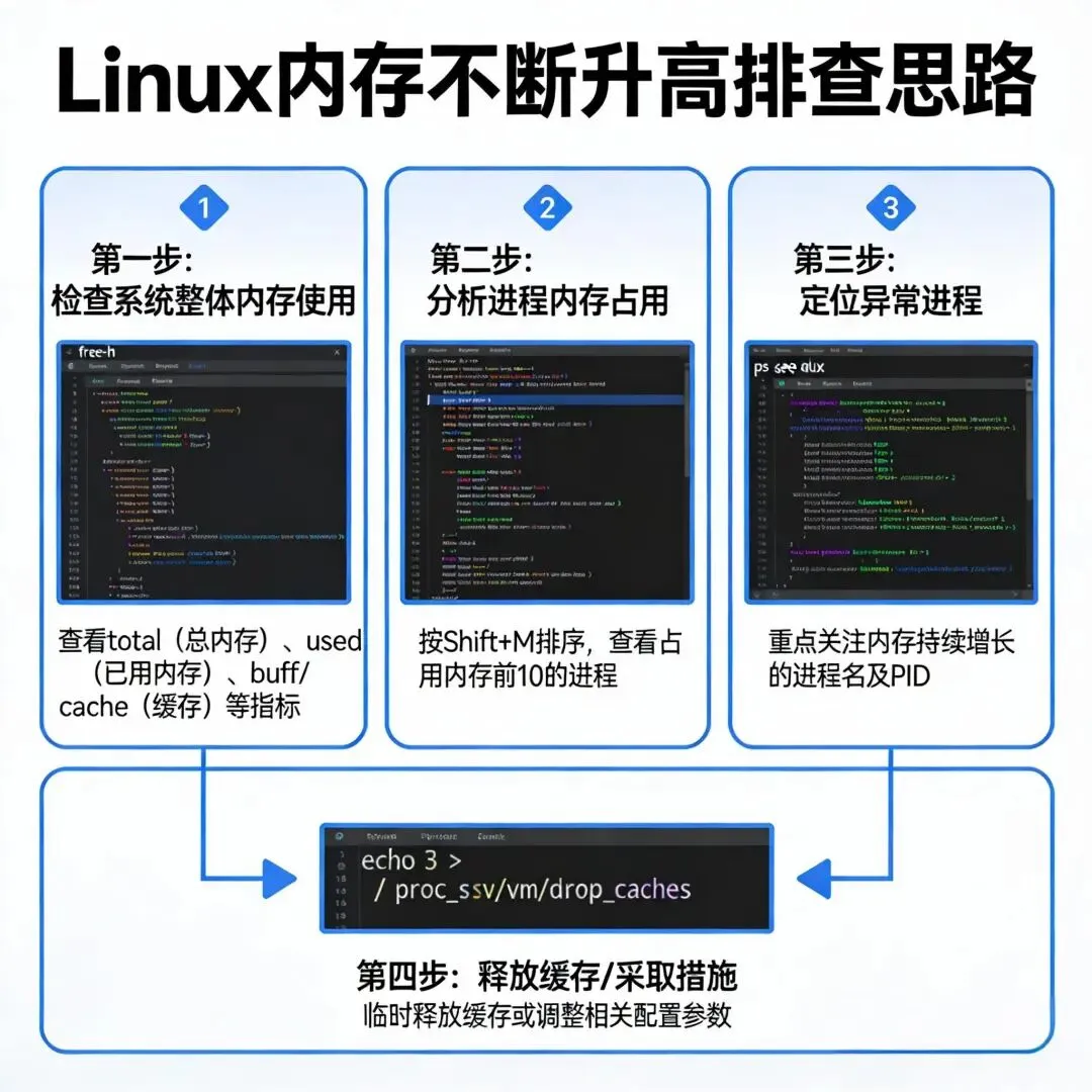 当top/htop没有明显指向罪魁祸首时。以下是一套系统性的排查方法,帮助你找到“隐藏”的内存消耗者:核心思路: 内存消耗不一定直接体现在某个用户态进程的RES或%MEM上。它可能来源于:- 内核本身: 内核数据结构(如slab缓存、页表、网络缓冲区等)泄漏或过度增长。
