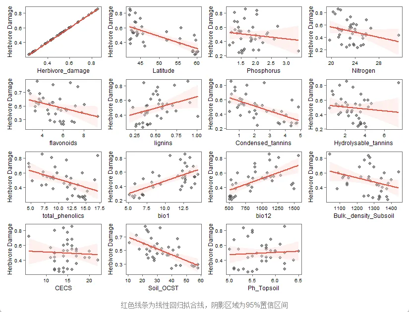 library(ggplot2)library(dplyr)library(tidyr)dat <- read.csv("C:/r-workspace/data/260106data.csv", header = TRUE,sep = ",")str(dat)summary(dat)dim(dat)plot_list <- lapply(names(dat), function(var) { ggplot(dat, aes(x = .data[[var]], y = Herbivore_damage)) + geom_point(color = "grey30", alpha = 0.7, size = 1.5) + geom_smooth(method = "lm", se = TRUE, color = "#e74c3c", fill = "#fadbd8", linewidth = 0.8) + labs(x = var, y = "Herbivore Damage") + theme_classic() + theme( panel.border = element_rect(color = "gray40", linewidth = 0.6, fill = NA), axis.line = element_line(color = "gray40", linewidth = 0.4), axis.ticks = element_line(color = "gray40", linewidth = 0.4), axis.title = element_text(size = 8), axis.text = element_text(size = 7), plot.margin = margin(4, 4, 4, 4, "pt") )})combined_plot <- wrap_plots(plot_list, ncol = 4) + plot_annotation( caption = "红色线条为线性回归拟合线,阴影区域为95%置信区间", theme = theme( plot.title = element_text(hjust = 0.5, size = 16, face = "bold", margin = margin(b = 10)), plot.subtitle = element_text(hjust = 0.5, size = 12, color = "gray40", margin = margin(b = 15)), plot.caption = element_text(hjust = 0.5, size = 10, color = "gray50", margin = margin(t = 10)), plot.background = element_rect(fill = "white", color = NA) ) )print(combined_plot)