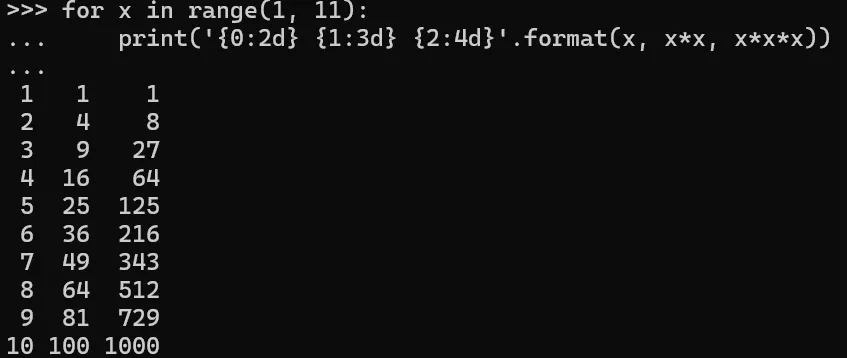 for x in range(1, 11):print('{0:2d} {1:3d} {2:4d}'.format(x, x*x, x*x*x))