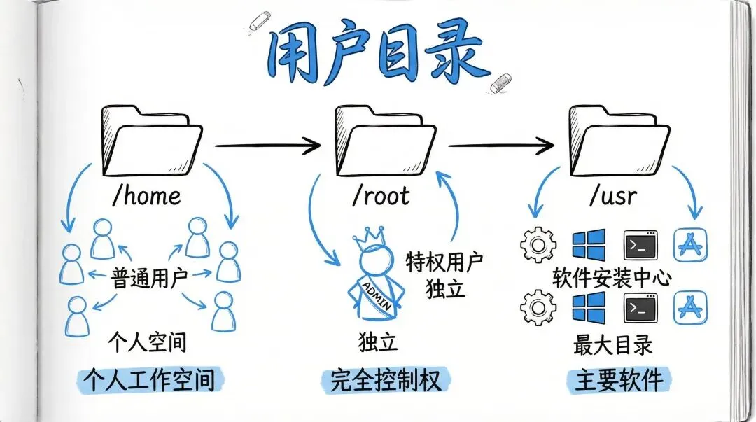 第二部分:用户目录。/home: 这是每个普通用户的个人工作空间。系统会为每个用户创建一个以其用户名命名的子目录,用户对自己的家目录拥有完全控制权,用于存放个人文件、配置和私有文件。/root: 系统管理员(root)的主目录。这是特权用户root的家,独立于 /home 之外,这里存的是管理员的私人文件和配置,普通用户没有权限访问。/usr: 这是 Linux 最大的目录之一,里面放的是用户级别的软件、库、命令。该目录就是“系统主要软件安装中心”。很多你安装的软件都会自动放到这里。
