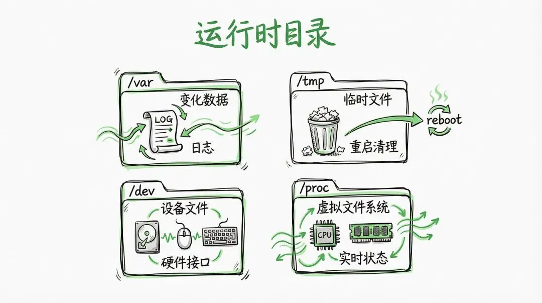 第三部分:运行时与可变数据目录,这些目录的内容在系统运行时会动态变化。/var: 这里存放的是经常变化的数据文件,例如系统日志、打印任务队列、数据库文件、网站内容、邮件等。/tmp: 是临时文件目录。供所有用户和程序存放临时文件。内存不足时,可以排查一下这个文件目录。通常系统重启时会自动清理这个目录。/dev: 是设备文件目录。这里不存放普通文件,而是以文件形式存在的各种硬件设备或虚拟设备的接口。你的硬盘、鼠标、键盘、甚至屏幕,在这个文件夹里都对应着一个文件。例如 /dev/sda 代表第一块硬盘,/dev/tty 代表终端。通过操作这些“文件”,程序就能与硬件交互。/proc: 进程与内核信息文件系统。这是一个虚拟的文件系统,它不占用磁盘空间,而是内核在内存中实时生成的。里面的“文件”反映了当前系统运行状态,如进程信息、硬件参数等。你可以通过查看这里的文件来获取系统信息。