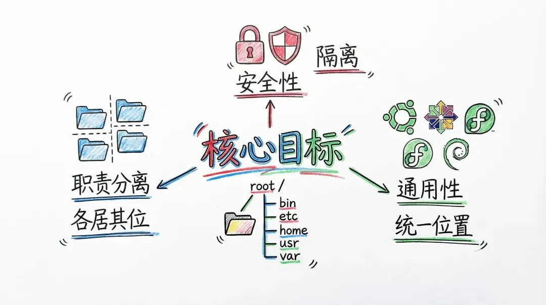 现在,让我们总结一下。在Linux的设计哲学里,“一切皆文件”。Linux文件系统通过这种严谨、统一的目录结构,实现了以下几个核心目标:第一,清晰的职责分离:系统文件、用户文件、配置文件、临时文件各居其位,互不干扰。第二,安全性:关键的系统目录与用户空间隔离。第三,通用性:无论你使用哪个Linux发行版,都能在相同的位置找到预期功能的文件,这极大地简化了管理和维护。