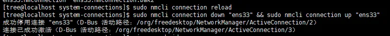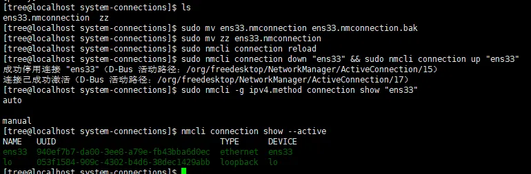这次再重新将dhcp改名成.bak备份文件,静态配置文件改回默认配置名称,重启网络,可以发现激活的还是dhcp的配置。