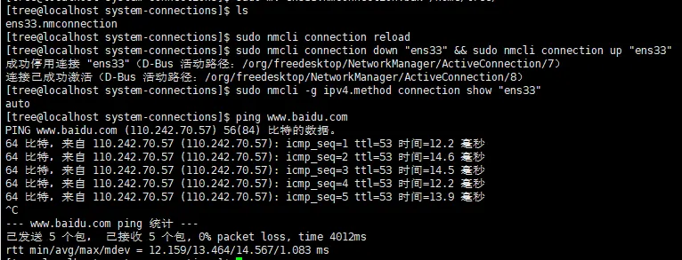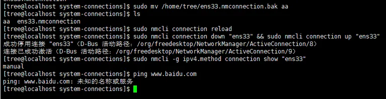 上图的整个流程是,先把静态配置文件移走,然后重启网络变成dhcp,然后再将静态配置文件移回来,但修改它的uuid,然后再重启网络。这次和之前不修改uuid对比,网络是通的。