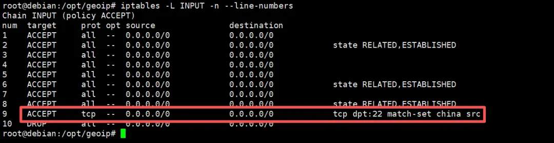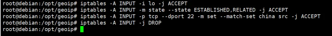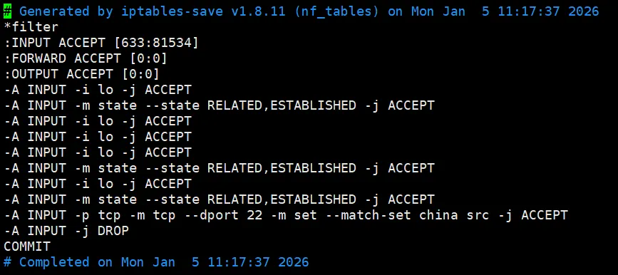 可以看到,第9条规则就是上面配置的 “放行 china 集合访问 22 端口”(match-set china src和tcp dpt:22)上面的设置,重启后会失效,需要做规则持久化,注意这是debian特有的路径,别的系统需要做相应调整:#安装iptables-persistent工具(确保重启后规则自动加载)apt install -y iptables-persistent#保存规则到Debian默认的配置文件iptables-save > /etc/iptables/rules.v4#后续如果修改了规则,保存后执行下面的命令生效netfilter-persistent savenetfilter-persistent reload