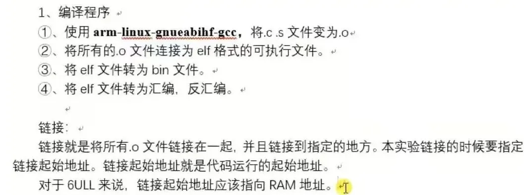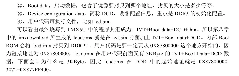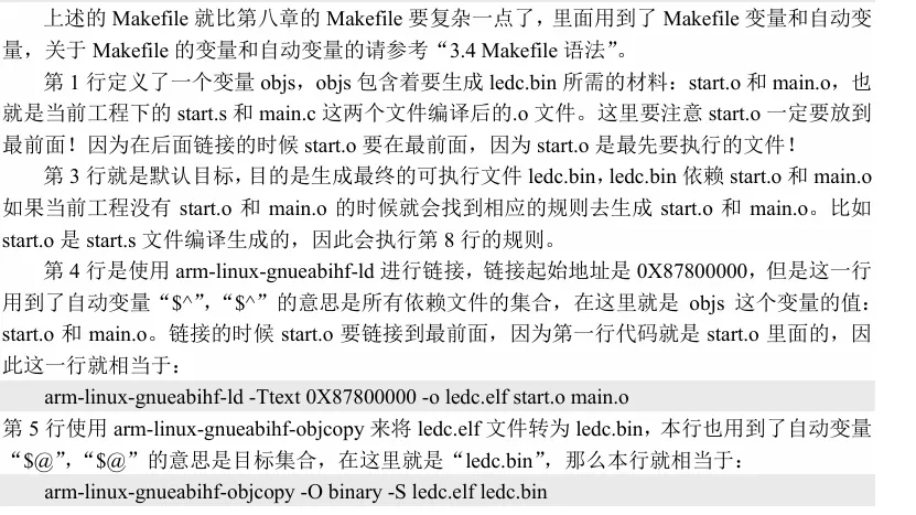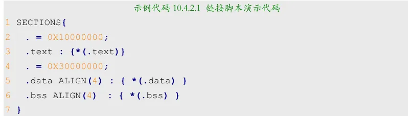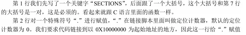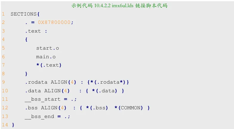 第 2 行设置定位计数器为 0X87800000,因为我们的链接地址就是0X87800000。第 5行设置链接到开始位置的文件为start.o, 因为start.o 里面包含着第一个要执行的指令,所以一定要链接到最开始的地方。第6行是main.o 这个文件,其实可以不用写出来,因为main.o的位置就无所谓了,可以由编译器自行决定链接 位置。在第11、13行有“__bss_start”和“__bss_end”这两个东西?这个是什么呢?“__bss_start” 和“__bss_end”是符号,第11、13这两行其实就是对这两个符号进行赋值,其值为定位符“.”, 这两个符号用来保存.bss 段的起始地址和结束地址。前面说了.bss 段是定义了但是没有被初始化的变量,我们需要手动对.bss段的变量清零的,因此我们需要知道.bss段的起始和结束地址, 这样我们直接对这段内存赋0即可完成清零。通过第11、13行代码,.bss段的起始地址和结束 地址就保存在了“__bss_start”和“__bss_end”中,我们就可以直接在汇编或者 C 文件里面使 用这两个符号。