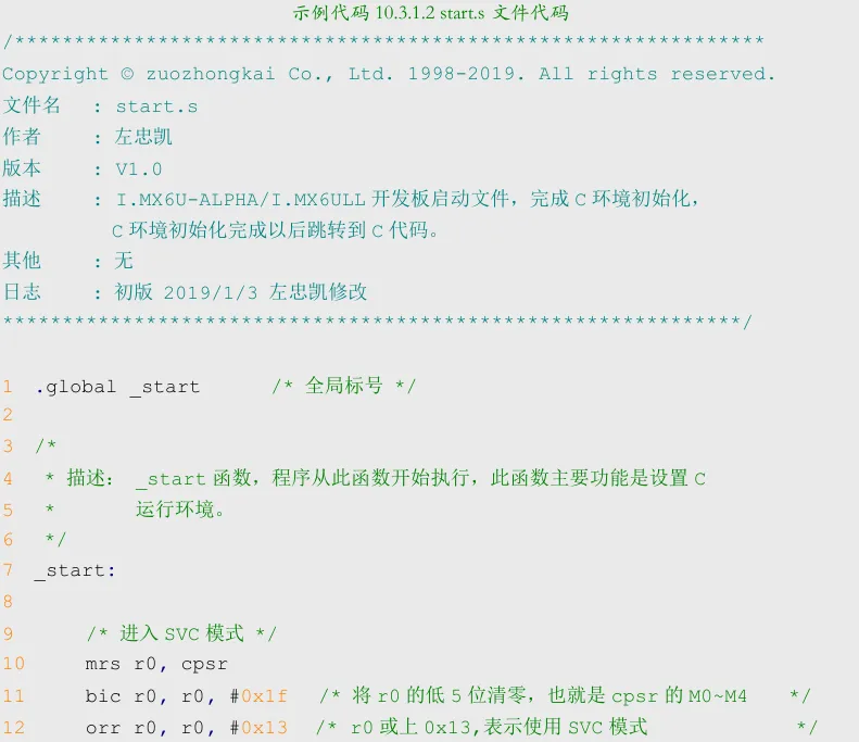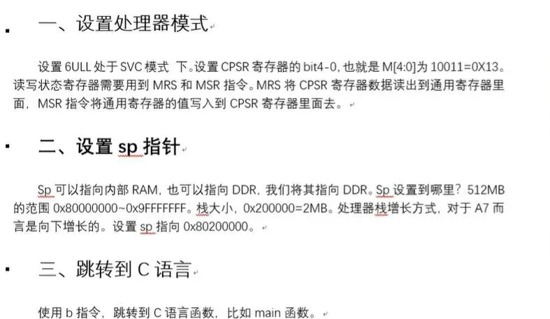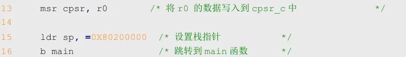 11~13行代码就是先使用指令MRS将CPSR 寄存器的值读取到R0中,然后修改R0中的值,设置R0的bit[4:0]为0X13,然后再使用指令 MSR将修改后的R0重新写入到CPSR中。