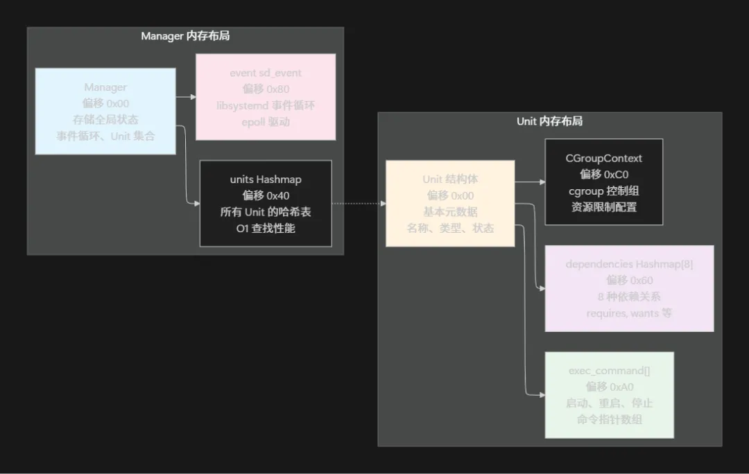 // Unit 结构体, 代表每个 systemd Unitstruct Unit { Manager *manager; // 指向全局管理器 char *id; // Unit 名称, 如 "sshd.service" char *description; // 描述 UnitType type; // Unit 类型 UnitLoadState load_state; // 加载状态 UnitActiveState active_state; // 活跃状态 // 依赖关系图 Hashmap *dependencies[UNIT_NTYPES]; OrderedSet *before, *after; // Before/After 依赖 // 启动和停止的可执行文件 ExecCommand *exec_command[_UNIT_EXEC_COMMAND_MAX]; // 重启策略和失败处理 int restart; usec_t timeout_start_usec; usec_t timeout_stop_usec; // 进程信息 pid_t main_pid; pid_t control_pid; // cgroup CGroupContext cgroup_context;};// Manager 结构体, 全局管理器, 协调所有 Unitstruct Manager { Hashmap *units; // 所有已加载的 Unit OrderedSet *startup_queue; // 待启动的 Unit 队列 // 事件循环 sd_event *event; // libsystemd 的事件循环 sd_event_source *sigchld_event_source; // 依赖关系图分析 Unit **unit_by_name; // 日志和输出 Hashmap *watch_jobs; // 监控中的 Job};// Job 结构体, 代表一个启动或停止任务struct Job { Manager *manager; Unit *unit; JobType type; // start, stop, reload 等 JobState state; // waiting, running, done 等 unsigned id;};