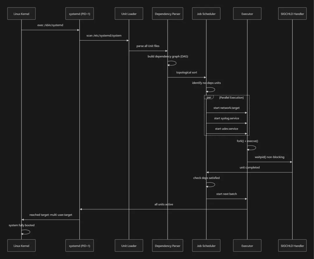 systemd 不是无限并行, 而是通过 DefaultDependencies、Before/After 链等机制保证关键的启动顺序. 比如, 网络必须在需要网络的服务之前启动, 系统日志必须在所有日志输出之前准备好. systemd 通过分析依赖图, 找到可以并行执行的分支, 大幅减少了启动时间