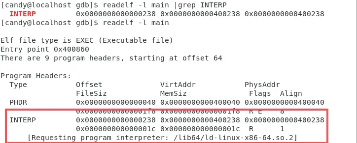 程序启动 → 加载动态链接器 → 解析程序动态段 → 加载依赖库 → 符号解析 → 重定位 → 初始化 → 程序执行当执行一个动态链接的程序时,内核首先检查ELF文件的程序头表,找到解释器段(INTERP),该段指定了动态链接器的路径:如下图所示
