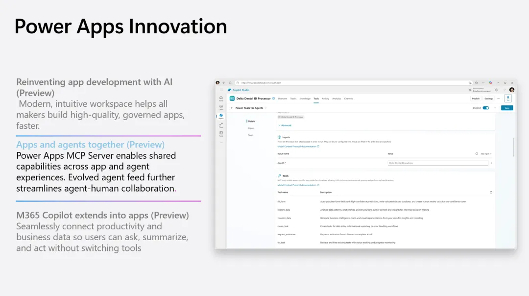 体验层的无缝融合: 基于 MCP,微软将 Copilot 的能力直接扩展到了 Power Apps 的运行环境中(Runtime)。用户无需在“业务应用”和“办公软件”之间频繁切换,可以直接在 App 界面内唤起 Copilot,让它读取 Outlook 邮件、Teams 会议记录或 SharePoint 文档,并结合当前应用中的业务数据进行分析、摘要或执行操作。