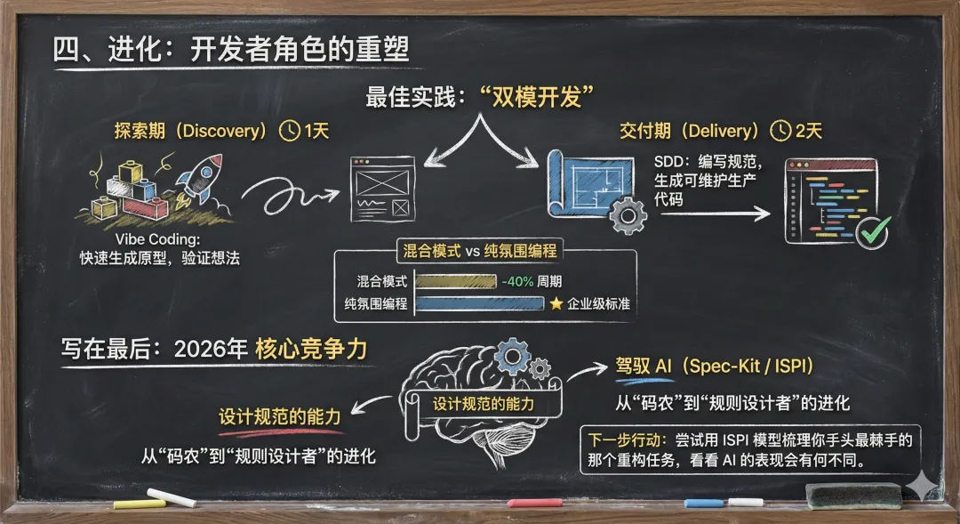 SDD 并不意味着我们要抛弃氛围编程。最佳实践是“双模开发”:探索期:使用 Vibe Coding 快速生成原型,验证想法(耗时 1 天)。交付期:切换到 SDD,编写规范,生成可维护的生产代码(耗时 2 天)。这种混合模式比纯氛围编程周期缩短 40%,且质量达到企业级标准。2026年,开发者的核心竞争力不再是手写代码的速度,而是设计规范的能力。当你能熟练运用 Spec-Kit 或 ISPI 模型来驾驭 AI 时,你就完成了从“码农”到“规则设计者”的进化。下一步行动:尝试用 ISPI 模型梳理你手头最棘手的那个重构任务,看看 AI 的表现会有何不同。好了,这就是我今天想分享的内容。如果你对构建企业级 AI 原生应用新架构设计和落地实践感兴趣,别忘了点赞、关注噢~