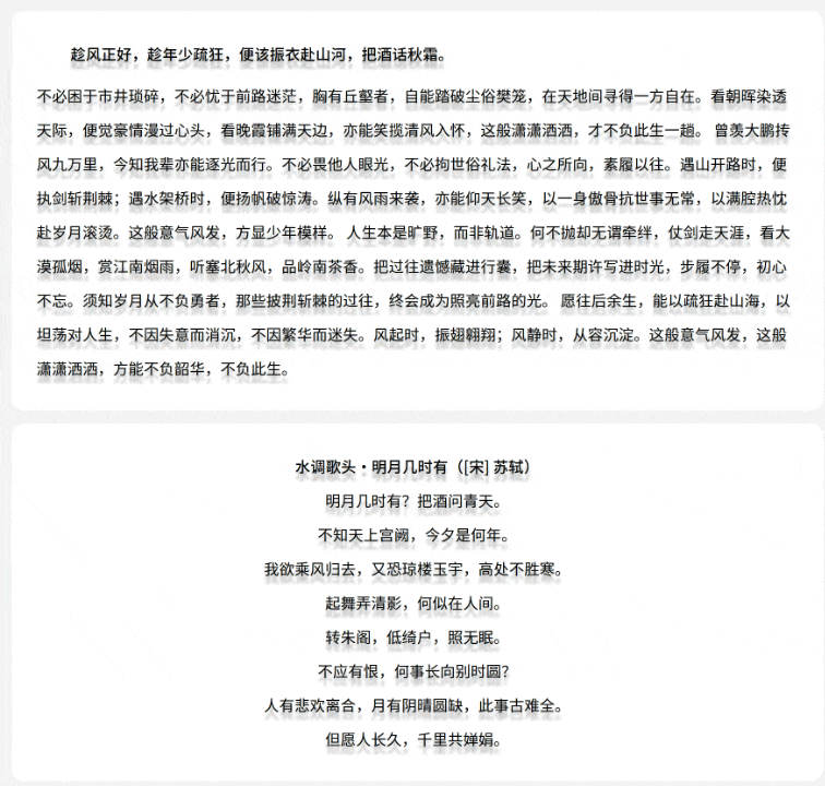 <template><divclass="card"><divclass="title"><h3class="underlines"> 趁风正好,趁年少疏狂,便该振衣赴山河,把酒话秋霜。</h3><spanclass="underlines"> 不必困于市井琐碎,不必忧于前路迷茫,胸有丘壑者,自能踏破尘俗樊笼,在天地间寻得一方自在。看朝晖染透天际,便觉豪情漫过心头,看晚霞铺满天边,亦能笑揽清风入怀,这般潇潇洒洒,才不负此生一趟。 曾羡大鹏抟风九万里,今知我辈亦能逐光而行。不必畏他人眼光,不必拘世俗礼法,心之所向,素履以往。遇山开路时,便执剑斩荆棘;遇水架桥时,便扬帆破惊涛。纵有风雨来袭,亦能仰天长笑,以一身傲骨抗世事无常,以满腔热忱赴岁月滚烫。这般意气风发,方显少年模样。 人生本是旷野,而非轨道。何不抛却无谓牵绊,仗剑走天涯,看大漠孤烟,赏江南烟雨,听塞北秋风,品岭南茶香。把过往遗憾藏进行囊,把未来期许写进时光,步履不停,初心不忘。须知岁月从不负勇者,那些披荆斩棘的过往,终会成为照亮前路的光。 愿往后余生,能以疏狂赴山海,以坦荡对人生,不因失意而消沉,不因繁华而迷失。风起时,振翅翱翔;风静时,从容沉淀。这般意气风发,这般潇潇洒洒,方能不负韶华,不负此生。</span></div></div><divclass="card"><divclass="title title-one"><h3class="underlines">水调歌头・明月几时有([宋] 苏轼)</h3><spanclass="underlines">明月几时有?把酒问青天。</span><br /><spanclass="underlines">不知天上宫阙,今夕是何年。</span><br /><spanclass="underlines">我欲乘风归去,又恐琼楼玉宇,高处不胜寒。</span ><br /><spanclass="underlines">起舞弄清影,何似在人间。</span><br /><spanclass="underlines">转朱阁,低绮户,照无眠。</span><br /><spanclass="underlines">不应有恨,何事长向别时圆?</span><br /><spanclass="underlines">人有悲欢离合,月有阴晴圆缺,此事古难全。</span ><br /><spanclass="underlines">但愿人长久,千里共婵娟。</span></div></div></template><stylelang="scss">.card {background: #ffff;margin: 15px;border-radius: 15px;.title {padding: 30px;font-size: 18px;h3 {width: fit-content;margin-left: 40px; }.underlines {line-height: 40px;cursor: pointer;text-shadow: 09px3pxrgba(0, 0, 0, 0.3);background: linear-gradient(to right, #ec6b5f, #61c554) no-repeat;background-size: 02px;background-position: right bottom;transition: background-size 2s; &:hover {background-position: left bottom;background-size: 100%2px; } } }.title-one {text-align: center;h3 {margin: 0 auto; } } }</style>