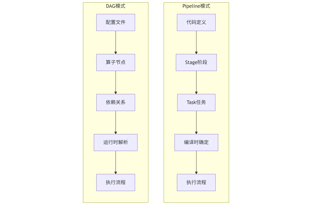 相比DAG的配置驱动,Pipeline采用代码驱动的编排方式。流程结构直接体现在代码中, IDE可直接追踪执行路径。这种显式化带来三方面价值:可读性提升,无需在多个文件间跳转; 可调试性增强,断点和日志可精确定位;可维护性改善,流程变更通过代码审查保证质量。